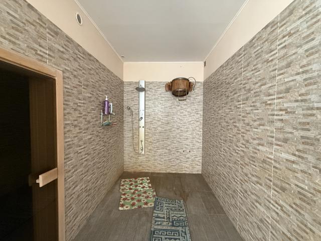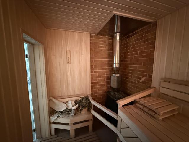 Через окремий вхід можна потрапити до лазні: дров’яна сауна, душова, санвузол, бойлер і кімната відпочинку з каміном.