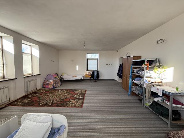Тут розміщена простора світла кухня-вітальня з виходом на терасу. У зоні відпочинку — камін і великий диван, а кухня обладнана меблями, газовою плитою, холодильником та плитковою робочою поверхнею. Є вода, стіни пофарбовані, підлога викладена плиткою.